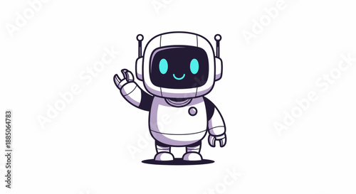 Friendly white robot character waving its hand and smiling, in a welcoming vector illustration.
