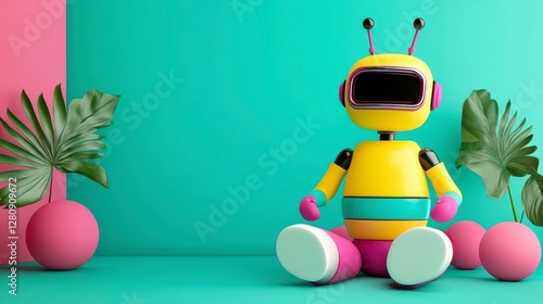 robot, cartoon, cute, friendly, yellow, pink, teal, leaf, sphere, background, vibrant, playful, cheerful, modern, three-dimensional, rendering, illustration, design, technology, artificial, intelligence, happy, fun, whimsical, colourful, bright, bold, minimalist, simple, clean, geometric, tropical, summer, digital, art, graphic, image, character, bot, machine, future, innovation, creative, concept, stylish, trendy, contemporary