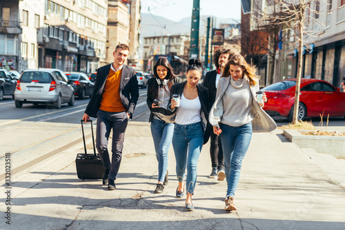 Friends Bonding, group of multi-ethnic friends walking on the streets talking to each other and smiling.
