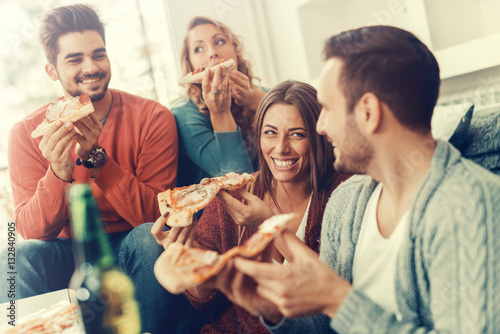 friends, group, pizza, eating, dinner, snack, fast food, beer, home, sharing, adult, unhealthy, alcohol, people, friendship, smiling, party, human relationships, man, laughing, indoor, female, human, facial, expression, drink, happiness, woman, togetherness, young, lunch, enjoyment, scene, lifestyle, cheerful, ravenous, casual attire, clothing, fun