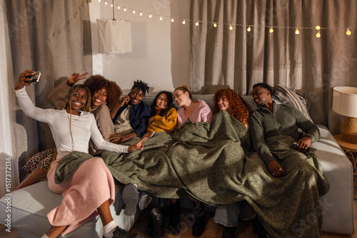 atmosphere, blanket, bonding, camaraderie, casual attire, cheerful, chill, comfort, connection, cosy, diverse, evening, friends, friendship, fun, gathering, glow, group, happiness, harmony, home, interior, joy, joyfulness, laughter, leisure, light, living room, memory, moment, multi-ethnic, relaxation, relaxing, selfie, smile, social, sofa, togetherness, unwinding, warmth, weekend
