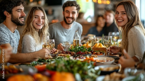 friends, group, dinner, meal, celebration, festive, gathering, smiling, laughing, wine, food, eatery, table, dish, salad, holiday, party, togetherness, enjoyment, happiness, leisure, casual attire, indoor, evening, lifestyle, young adult, cosy, friendship, dining, appetising, delicious, drink, cookery, laughter, happy, socialising, bonding, variety, colourful, modern, trendy, vibrant, atmosphere, cheerful, relaxed, occasion, fun