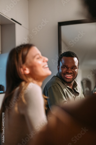 home, attractive, beautiful, evening, friends, joy, man, people, person, talk, talking, together, woman, young