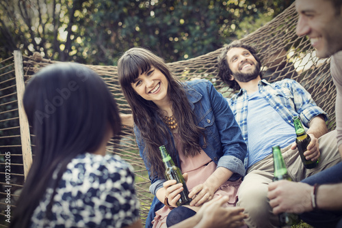 man, woman, caucasian, young, adult, friends, to sit, lean, smile, talk, hold, beer, bottle, hammock, large, alcohol, drink, beverage, fresh, refreshment, fun, lifestyle, togetherness, friendship, 4, group, casual attire, outdoors, day, people