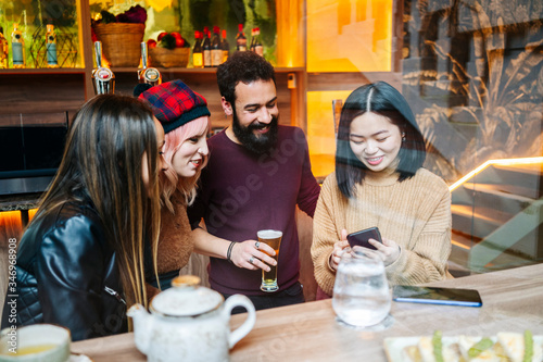 beer glass, glass pane, mobile phone, smiling, drinking, joy, cheerful, enjoying, happiness, leisure, together, fun, meeting, connection, cafes, eatery, beer, counter, indoor, technology, going out, using, casual attire, bar, memory, accessibility, community, sharing, carefree, wireless, friends, smartphone, socialising, encounter, hip, missy, young men, four people, caucasian, asian ethnicity, spain, dish, glasses, window, communication