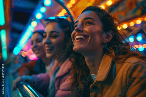 friends, amusement, park, ride, thrilling, attractive, woman, smiling, joy, fun, happiness, excitement, adventure, group, entertainment, outdoors, summer, vacation, together, laughter, carefree, vibrant, energetic, celebration, youth, leisure, playful, bonding, cheerful, life events, enjoyment, exhilarating, carnival, delight, bliss, jubilation, amusement park, ride, thrill, happy, joyful, night, roller coaster, female, smile, laughing