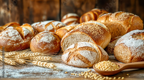 Frisches Bauernbrot mit Mehl und Ähren auf rustikalem Holztisch