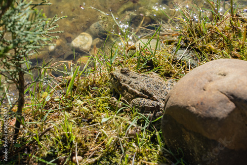 Frog camouflaged among green grass and moss near shallow, clear stream with rocks and aquatic plants.Banks of magical garden pond are inhabited by amphibians.