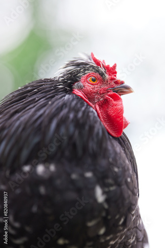 Frog perspective on head of black rooster on sky background