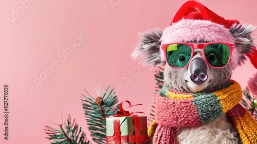 Frohe Weihnachten Urlaub Winter Grußkarte mit deutschem Text - Cooler Koalabär mit Weihnachtsmannmütze, Sonnenbrille und Geschenken, isoliert auf pinkem Hintergrund