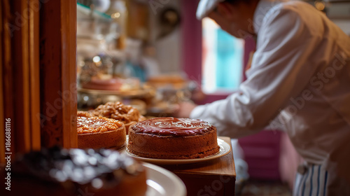 From a doorway, watching bakers decorating cakes, icing swirling, sweet aromas implied. With copy space.