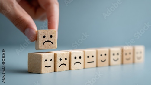 From Sadness to Happiness: A hand gently lifts a wooden block depicting a sad face, symbolizing the transformation of emotional states, moving from unhappiness towards joy and well-being.