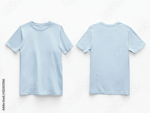 Front and back view mockup of light blue t-shirt studio setting apparel showcase minimalist style