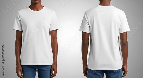 Front and back view of a man wearing a plain white tshirt, isolated on a gradient background