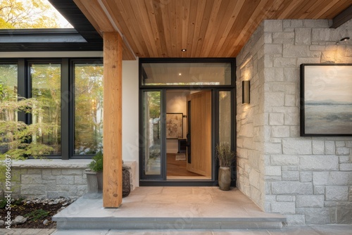 modern, house, front, entrance, stone, structure, wooden, beam, residential, area, daylight, greenery, large, window, inviting, space, interior, design, entranceway, nature, landscaping, home, architecture, doorway, contemporary, style, yard, light, decor, building, wood, stone, idea, welcoming, calmness, view, plant, step, door, clean, line, glasses, open, natural, minimalist, cosy, environment