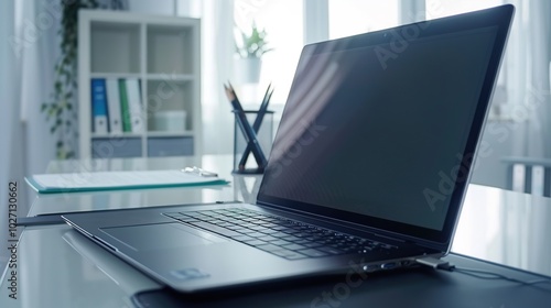 Front view laptop on white table. There is paper and a pen holder nearby. In modern office space