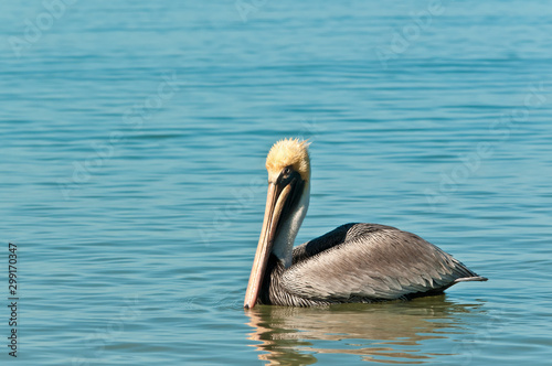 Front view, long distance of a single brown pelican swimming in search of food near a tropical beach on the coast of the gulf of Mexico on a sunny, winter day