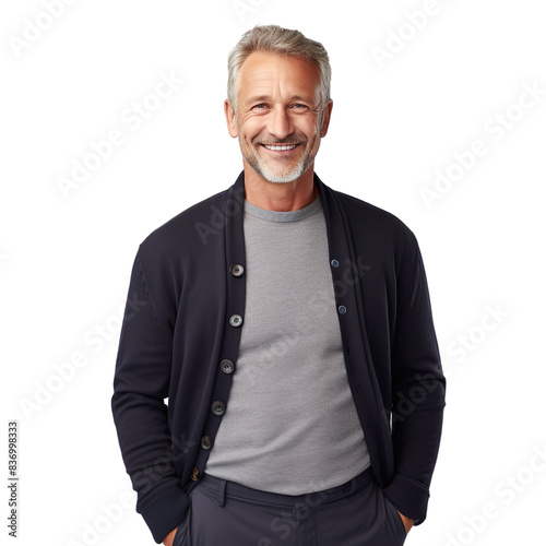 man, white, cardigan, deep, charcoal, grey, dress, trousers, smiling, transparent, background, mid, shot, front, view, photogenic, business, casual attire, confident, mature, portrait, isolated, fashion, stylish, gentleman, comfortable, relaxed, attire, male, senior, joyful