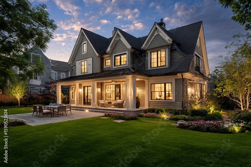 Front view of a beautiful new traditional-style home with a porch and landscaping at dusk, with night-time lighting, a neutral color palette, shingle exterior walls, a green grass lawn in the front ya