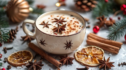 Front view of a hot white cup surrounded by star anise cinnamon sticks dried orange slices and some christmas decoration
