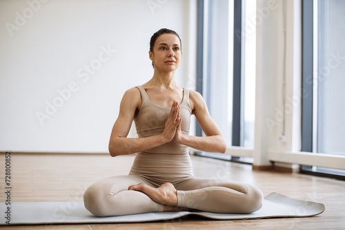 Front view of caucasian lady in beige athletic wear doing Padmasana exercise on rubber mat in bright fitness studio. Yoga practitioner improving concentration with namaste gesture in lotus pose.