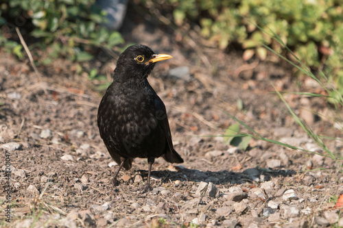 blackbird, bird, common, ground, male, sun, wing, black, thrush, dirt, summer, front, view, head, turned, closeup, closeup, yellow, beak, songbird, wild, wildlife, animal, nature, cute, denmark, europa