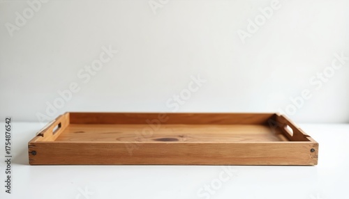 Front view of rustic wooden tray on white table against white backdrop. Simple tray offers clean lines ample space. Wooden texture creates inviting warmth natural feel.