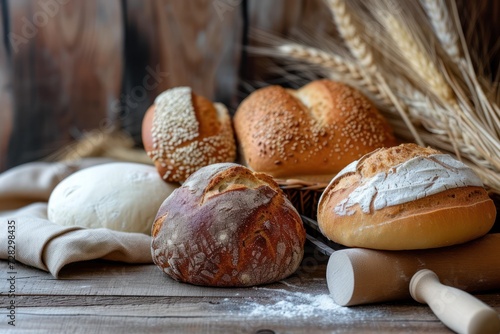 Front view of various types of bread on a rustic wooden table. The composition includes a bread knife, a rolling pin and some ear of wheat.