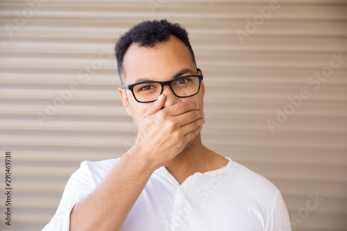 Front view of young man covering mouth with hand. Cheerful young guy in eyeglasses. Concept of surprise