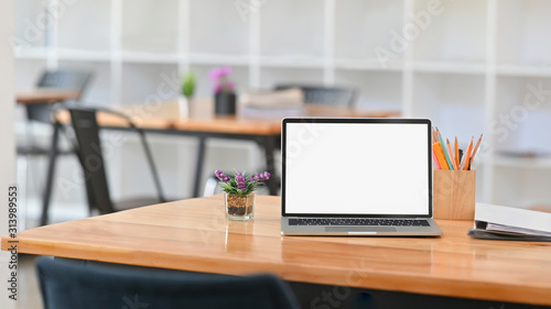 Front view Photo of white blank screen laptop on working desk. Including pencil holder, document files and potted plant on the work desk.