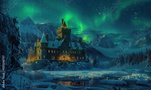 castle, northern, light, fantasy, building, ancient, old, architecture, water, fort, landmark, beautiful, gothic, tale, wall, town, fortress, destination, travel, culture, story, night, cloud, magic, sky, historic, europa, palace, background, park, city, winter, attraction, fairy tale, tower, art, landscape, snow, illustration, tour tourism, church, fairy, mediaeval, history, heritage, house