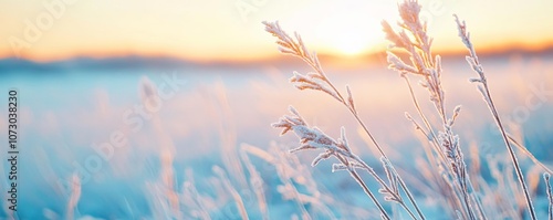 Frost-covered meadow at sunrise, ambient cold light, delicate winter landscape, peaceful scene