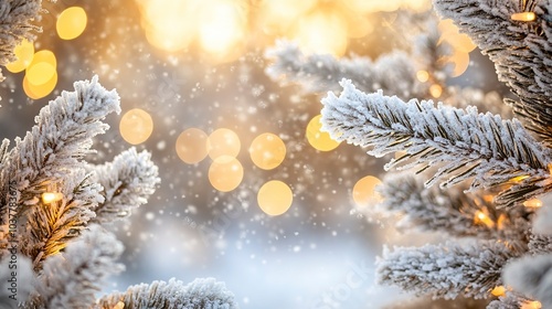 Frost-covered pine branches framing the edges, soft snowfall, warm golden lights twinkling in the background, blurred festive bokeh, cozy holiday feel, balanced lighting, wide-angle close-up.