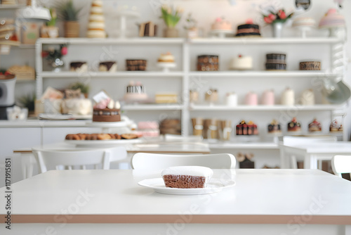 cake, frosted, bakery, pastry, table, white, plate, shelf, dessert, sweet, treat, food, confectionery, brown, cream, sugar, flour, oven, bake, chocolate, vanilla, strawberry, red, pink, white plate, background, blurred, shop, store, display, window, counter, chair, seating, client, business, delicious, pastry shop