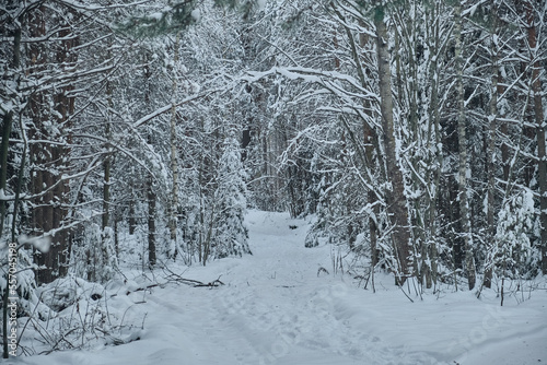 frosty forest snow-cowered fir and pine trees winter road background Christmas Scene