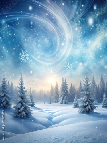 Frosty landscape with swirling snowstorm overlay