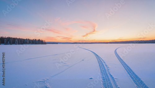 Frosty plain with fading sled marks at twilight, solitude and tranquility