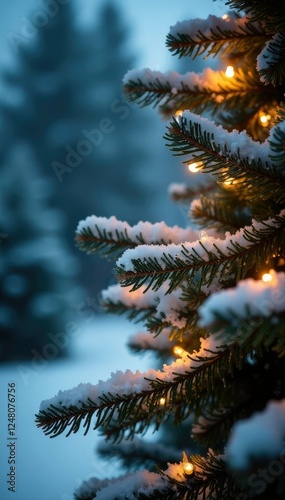 Frosty tree branches adorned with twinkling lights, evergreen trees, holiday decor, winter wonderland