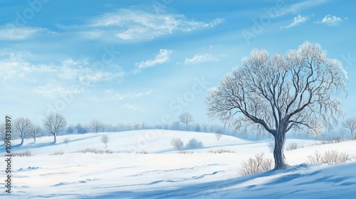 Frosty winter landscape with snow-covered fields and leafless trees under a crisp blue sky