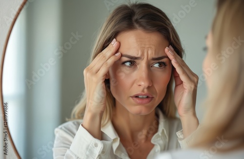 woman, face, skin, ageing, ageing, problem, care, insecure, rejuvenation, wrinkled, wrinkle, forehead, frustrated, mirror, home, businesswoman, stressful, profession, professional, facial, frustration, bad, concerned, worried, eyebrow, expression, collagen, unhappy, 30s, 30, upset, displeased, sad, older, 40s, lady, self, image, mature, issue, work, premature, anxious, complexion, stressed, health care, dermatology, cosmetic, beauty, therapy