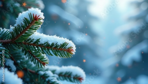 Frozen fir tree branches with colorful needles, snowflakes, frozen branches