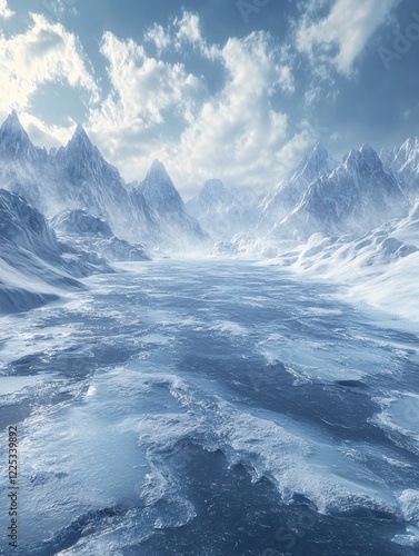 Frozen landscape with majestic mountains and icy lake under a cloudy winter sky