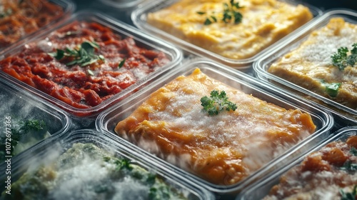 Frozen meals neatly arranged with frost-covered dishes like lasagna and curry
