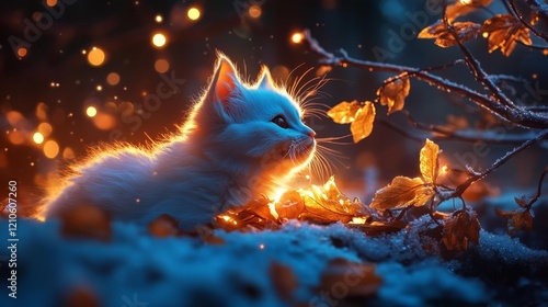 cat, glowing, winter, snow, serenity, light, icy, forest, peaceful, animal, kitten, nature, snowflake, cold, blur, delicate, leaf, magical, night, outdoors, tree, twinkle, glacé, frosty, tranquil, snow-covered, dreamlike, aethereal, soft, fluffy, stillness, motion blur, serene, warmth, soft light, gold, orange, white, winter landscape, bokeh, misty, ambient, quiet, mysterious