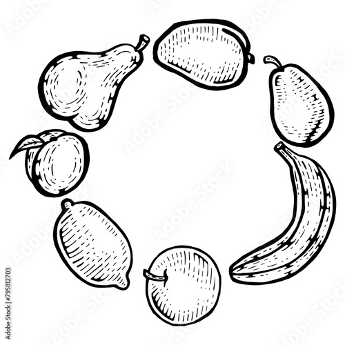 vignetting, fruit, set, food, vegan, nature, fresh, healthy, banana, lemon, pear, apple, plum, mango, plant, retro, cartoon, illustration, vintage, clip art, black-and-white, black, engraving, etching, woodcut, engraved, design, hand-drawn, poster, isolated, white background, drawing, colours, drawn, old, graphic, hand-made, ink, line