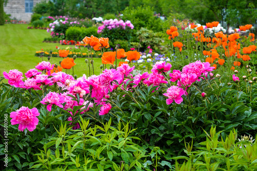 Fuchsia blossom peonies and red anemones. Luxury european garden. Floral composition, stylish garden design. Grass, lawn, bushes, flowers, trees. Seasonal colorful photo for nature calendar, print