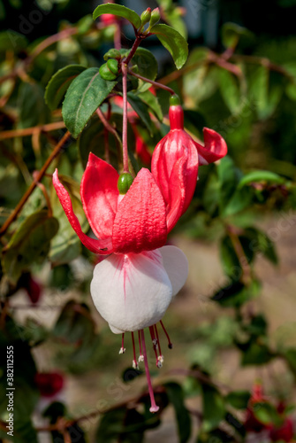 fuchsia, plant, flora, floral, floristic, garden plant, flower, blossom, bloom, blooming, beautiful, beauty, shrub, bush, tropics, greenhouse, houseplant, pot plant, evergreen, ornamental plant, floriculture, gardening, tropical, nature, natural, outdoors, garden, park, green, colourful, bright, america, pink, red, white