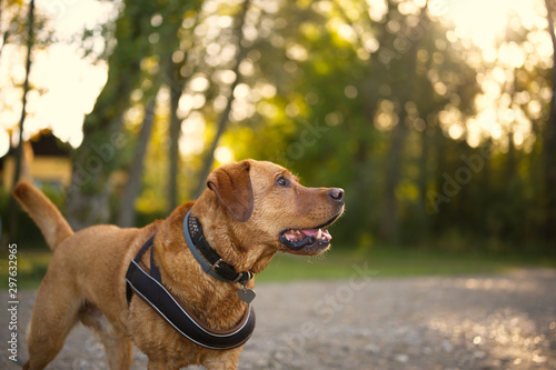 Fuchsroter Labrador Retriever in herbstlichem Wald