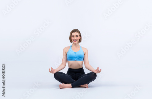Full body length gaiety shot athletic and sporty woman doing healthy and meditative yoga exercise workout posture on isolated background. Healthy active and body care lifestyle