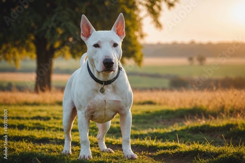 bull terrier, dog, full body, blurred background, countryside, copy space, pet, animal, white, muscular, strong, cute, loyal, breed, companion, adorable, domestic, playful, energetic, outdoors, nature, field, grass, sunny, day, sunlight, protection, guard, looking, standing, alert, intelligent, facial expression, ear, tail, sturdy, powerful, stocky, square, head, eye, nose, mouth, teeth, fur, white coat